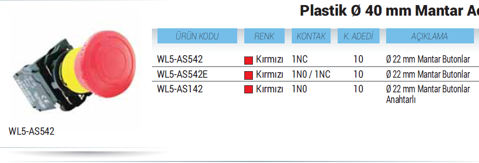 WL5 Serisi Plastik 40mm  Anahtarlı Mantar Acil Stop Buton